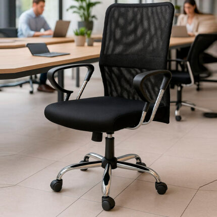 Silla Operativa Respaldar en malla con Tela Vertigo Asiento en malla con Tela Vertigo y espuma alta densidad Brazo Metálico cromado Poliuretano Curvatura Lumbar Mecanismo de Pistón de Altura Base Cromada & Rodin de Nylon