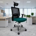 Silla Operativa Respaldar en Malla Brazo Metálico cromado Poliuretano Curvatura Lumbar Mecanismo de Pistón de Altura Base Cromada & Rodin de Nylon